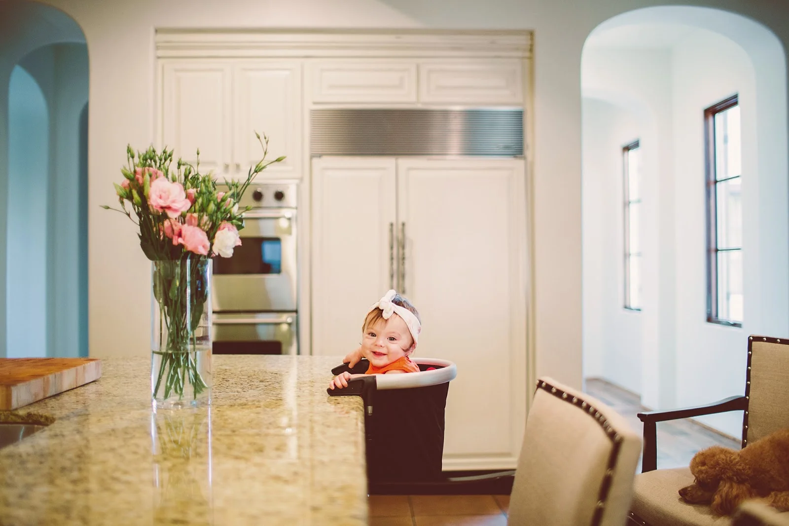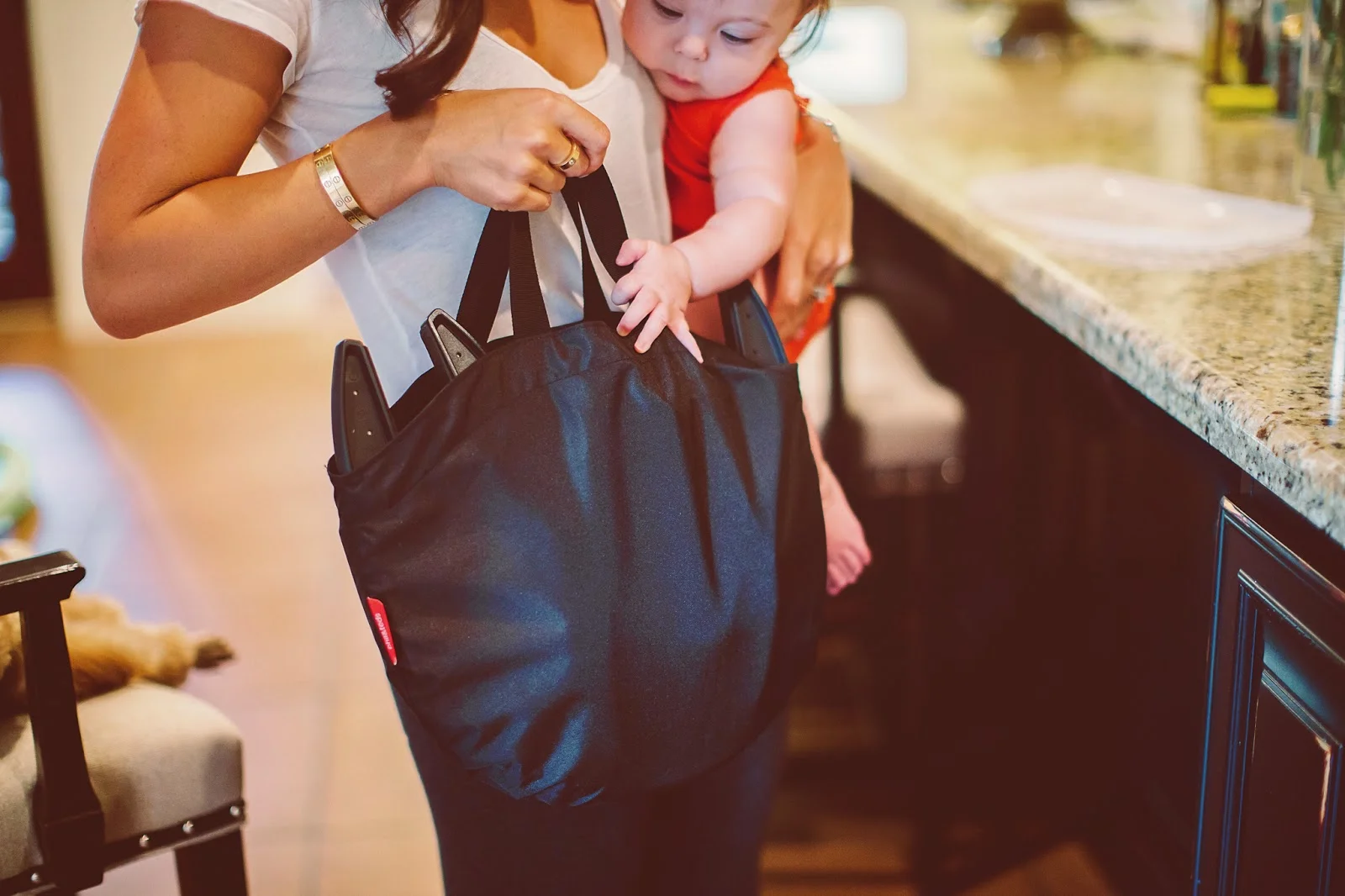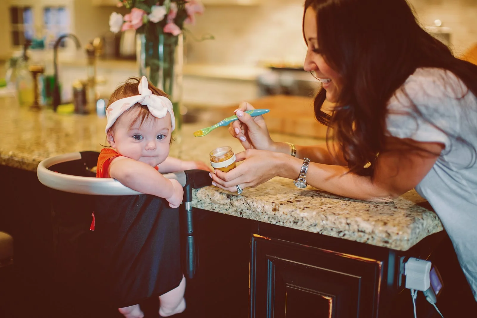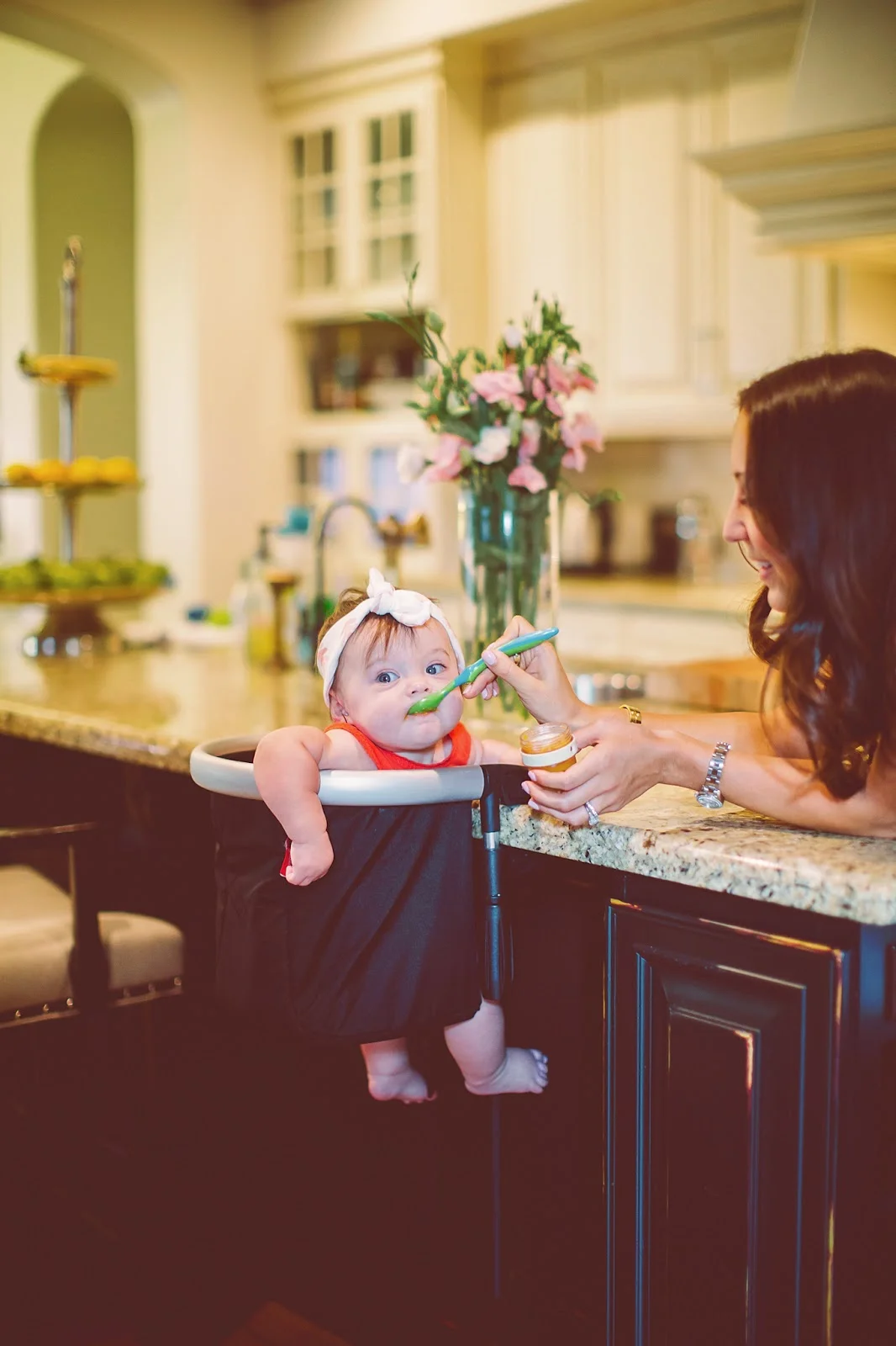I know this highchair looks scary or like it's going to fall any minute, but I promise you, this is one STURDY chair. It holds babies up to 37lbs! Woah! What I love most about this product is how easy it is to clean. The material is water proof, allowing you to wipe anything off with a wet towel or sponge. Sometimes I even run it under the sink and shake it off for a quick clean. No need to dry it off. Time saver for sure!