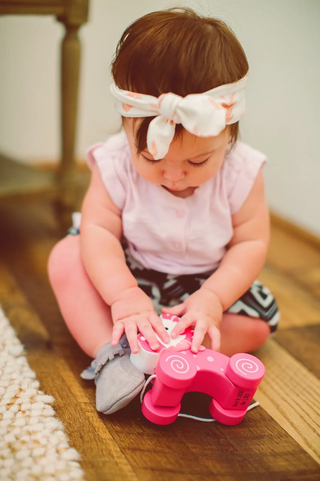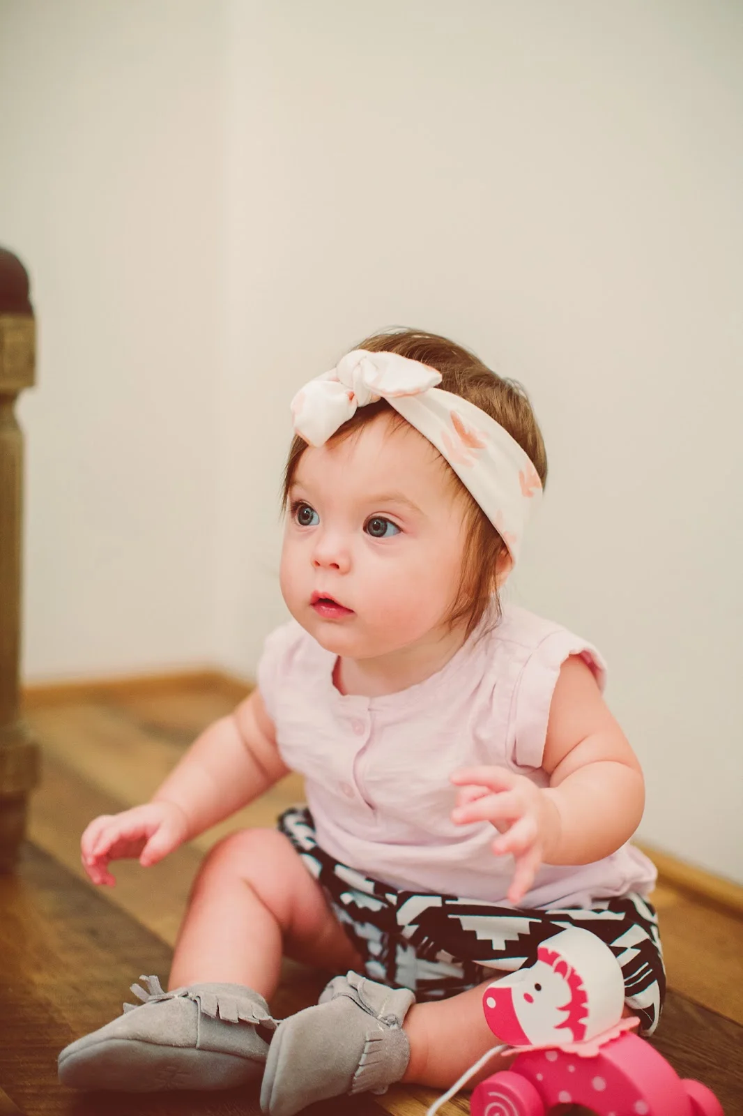 on Etsy. All of their clothing is super comfy, handmade, and the patterns are unlike anything you'll find in big department stores. I paired Chacha's bloomers with a powder pink tee from Gap baby, a pink feather head band from