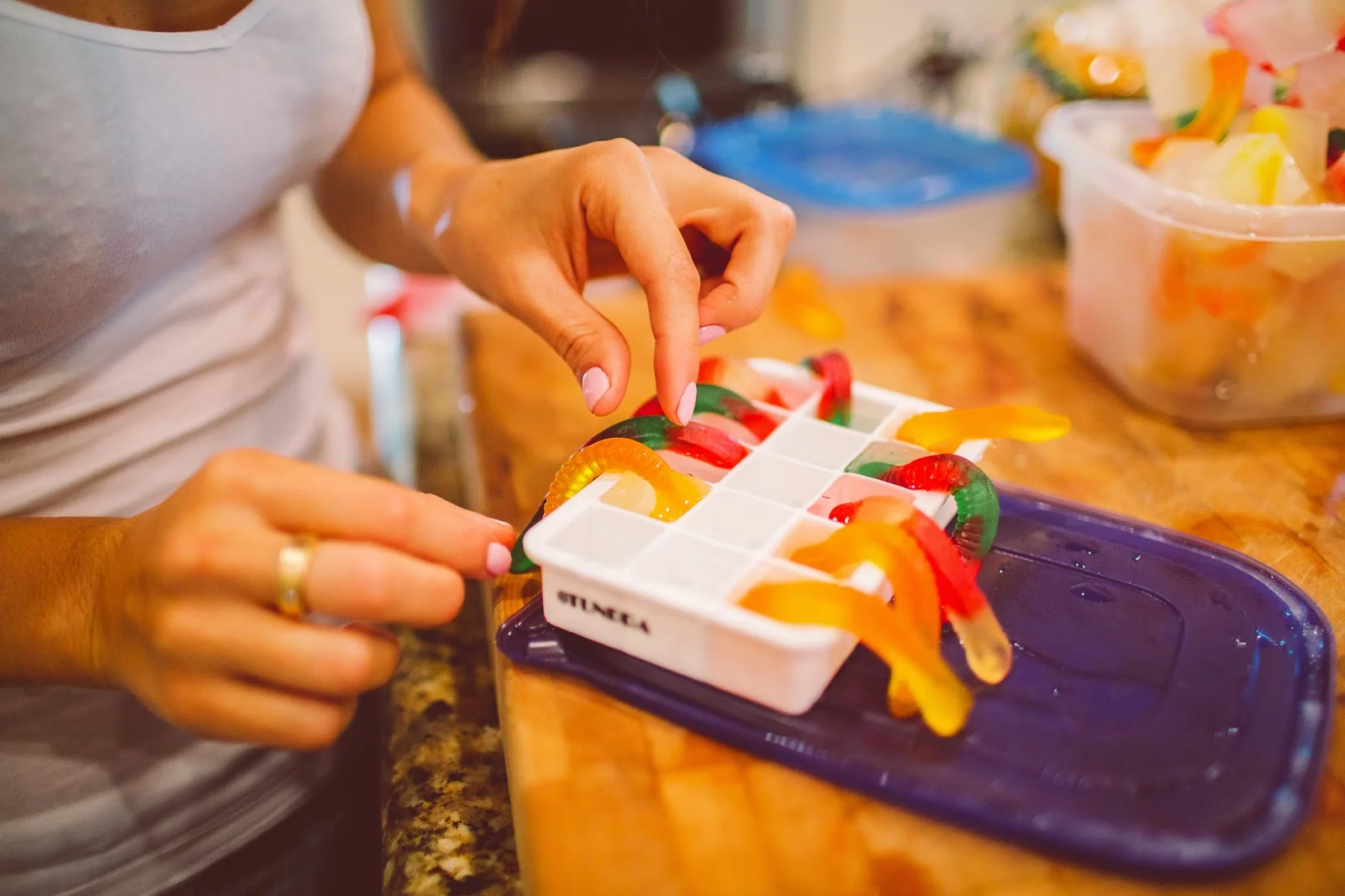 - Put each tray on a flat surface (I used a storage container lid) to allow the gummy worms to hang out of each cube. This insures the worm won't get frozen to a shelf in your freezer
