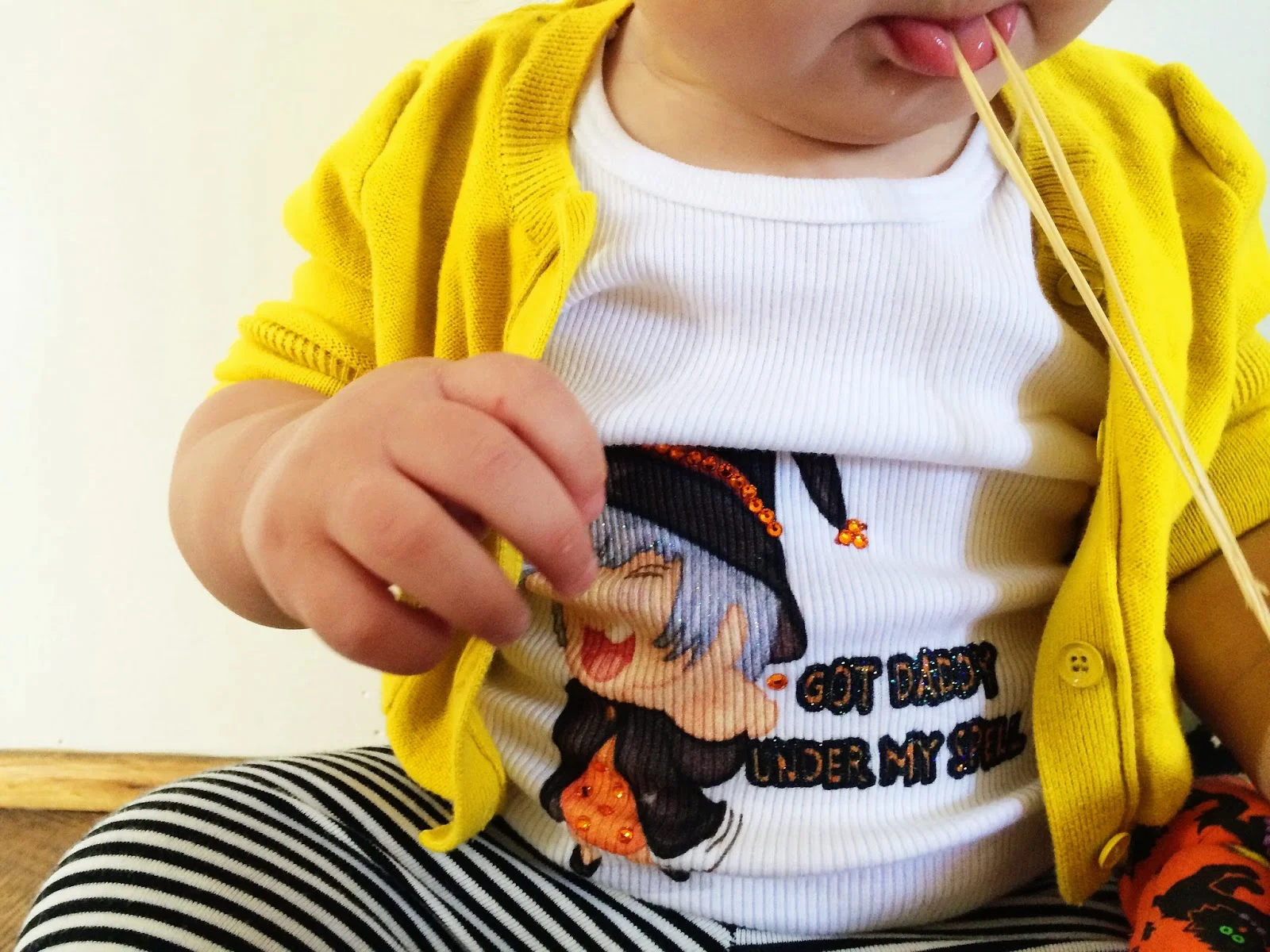 was a must have for her. I met Christina, the owner and designer of Ivanhoe Couture a couple months ago and not only fell in love with her, but was blown away by her incredible line of clothing for both boys and girls. Christina makes everything from tees, to tanks, tutus and even shoes! Check out these little orange and black, rine-stoned slippers! What I love most about her clothing is everything is super comfy and made with non toxic inks. She is very mindful of what's best for your little ones and the best part... she specializes in personalization! I paired Chacha's outfit with a solid yellow sweater from Baby Gap and some leggings from Target.
