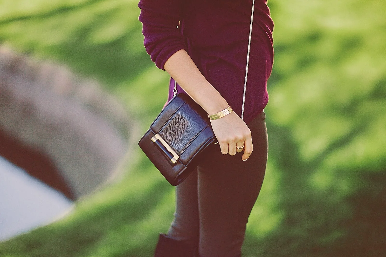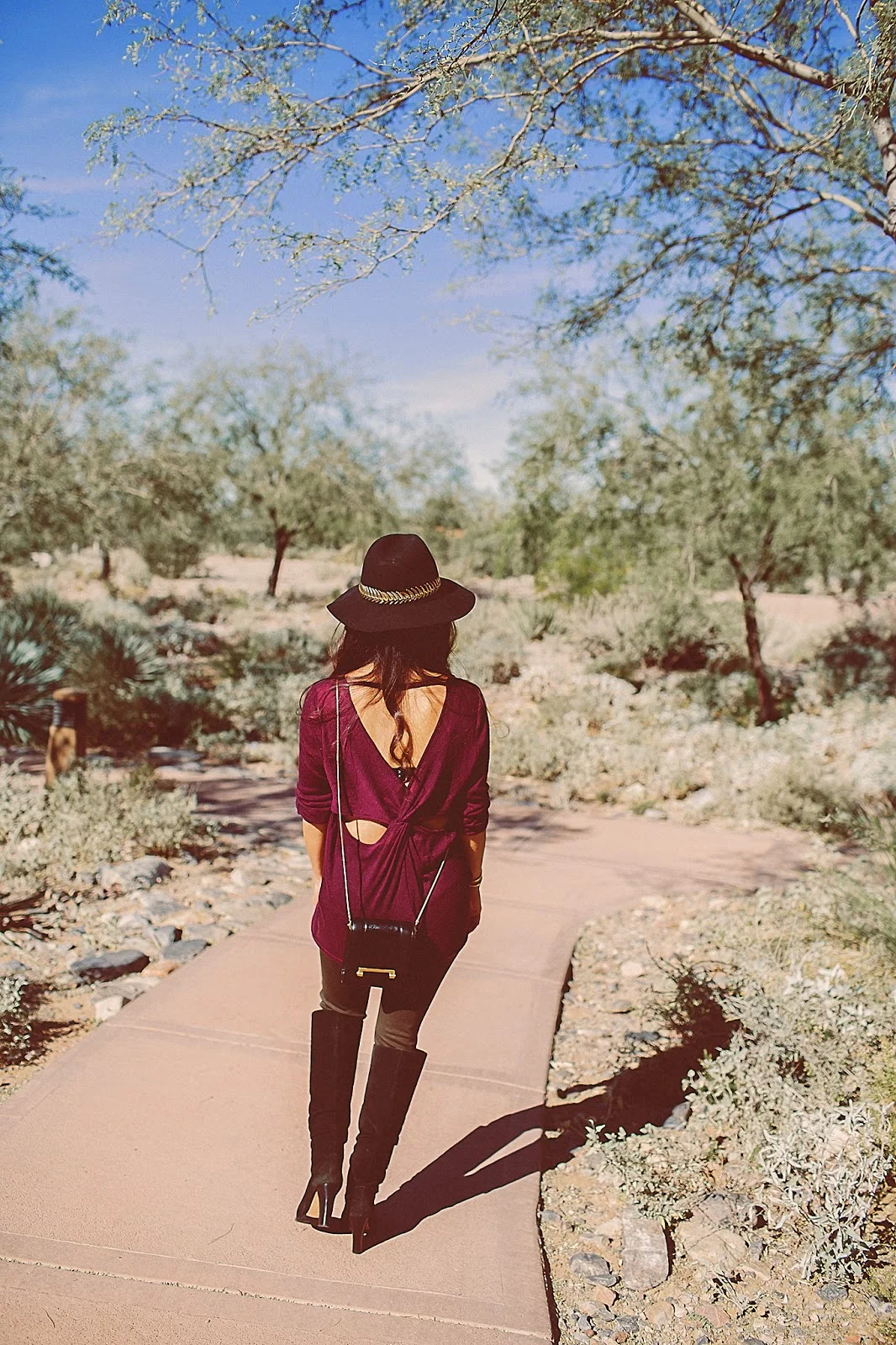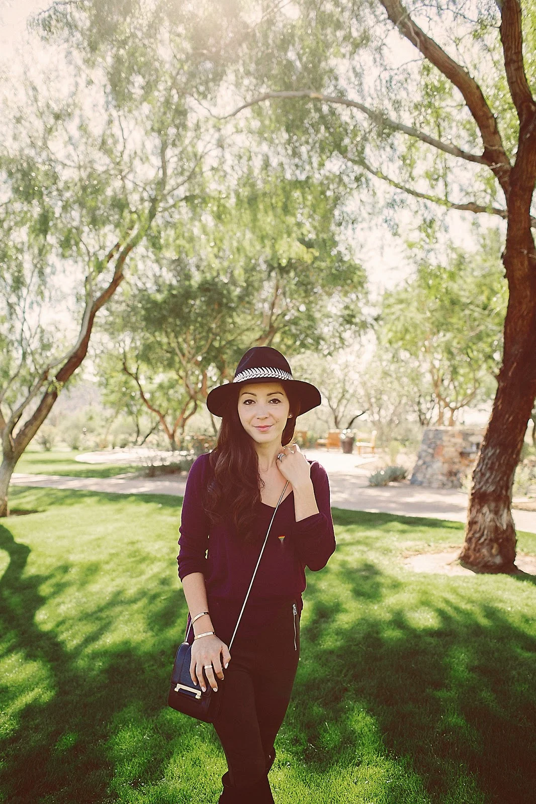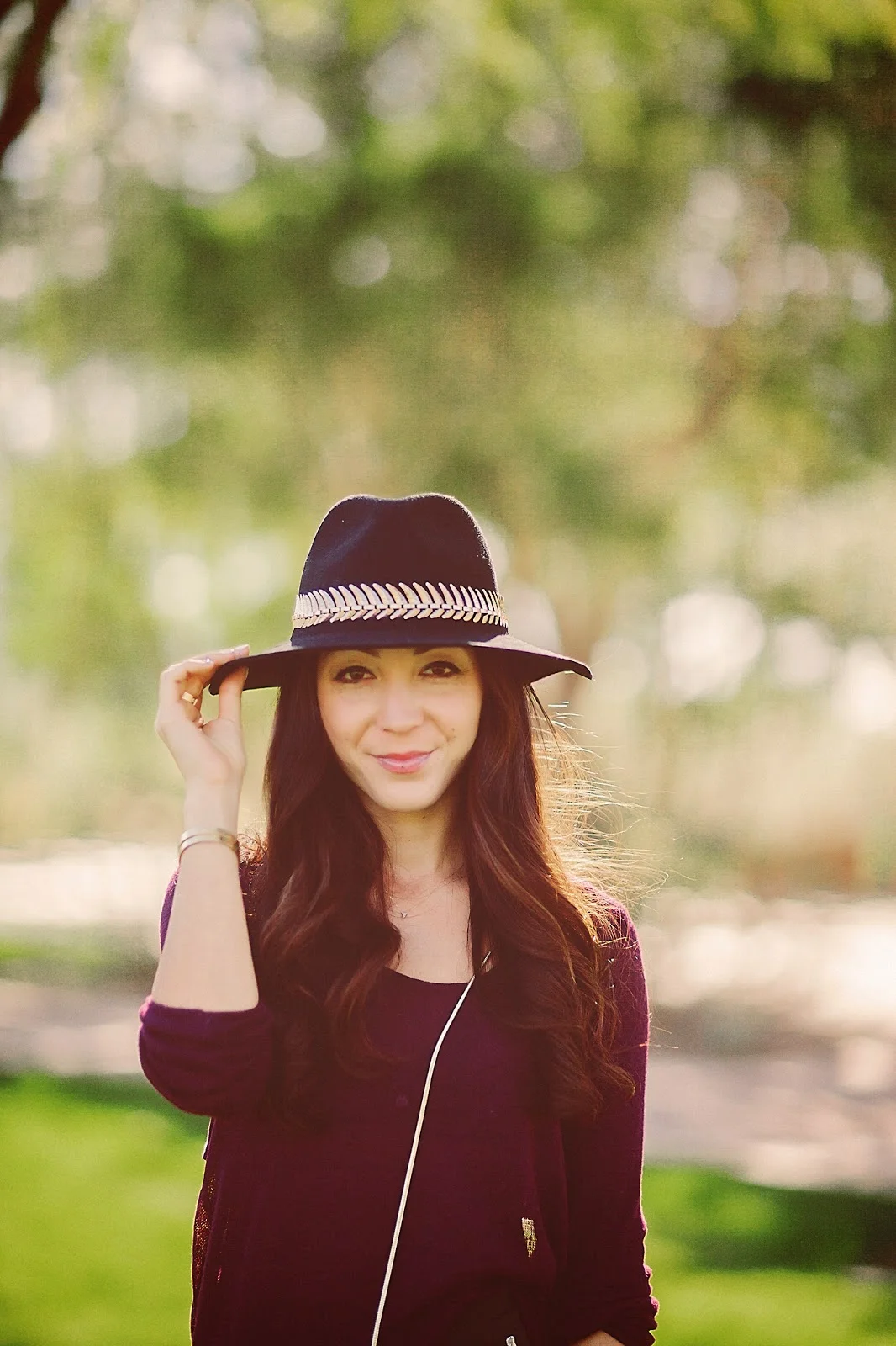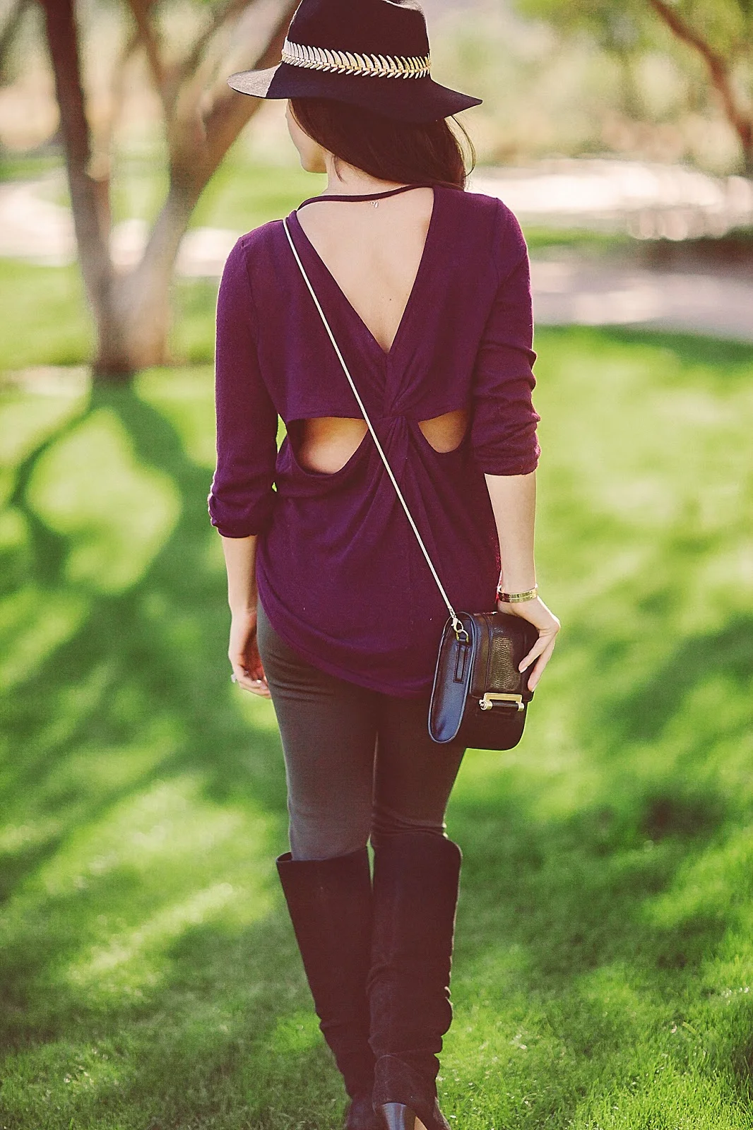 This Cyber Monday, I'm sharing one of my favorite cut out sweaters from H&M. This wine colored, knotted back is a fun way to spice up your typical winter wardrobe. I paired it with some zipper leggings from Zara, a black felt hat from Bebe, and a DVF clutch that I found for a steal at Last Chance.